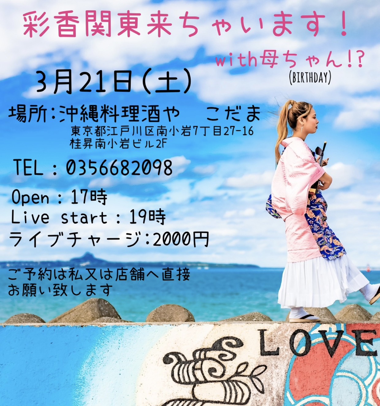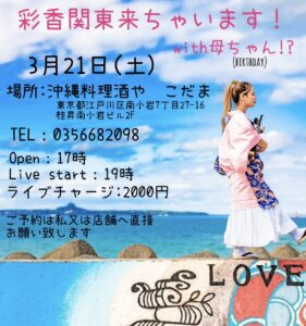 投稿日: 2026年3月21日2026年2月27日 投稿者: izakayakodama大畑彩香 3月21日(土)open17:00 start19:00 charge¥2,000【民謡/Pops】 沖縄県国頭郡東村生まれ。 幼少時より三線や島太鼓に興味を持ち 島太鼓などでステージに立つ。 20歳の年にミニアルバム【赤花】リリース。 また三線や島太鼓、唄などで他のアーティストのレコーディングにも参加。 現在は県内外でのんびり活動中。