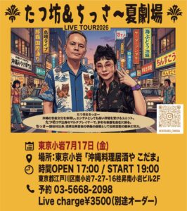 投稿日: 2026年7月13日2026年4月13日たつ坊&ちっさー(伊集タツヤ&比嘉千咲) 7月17日(金)open17:00 start19:00 charge¥3,500【Pops】 伊集タツヤ&比嘉千咲